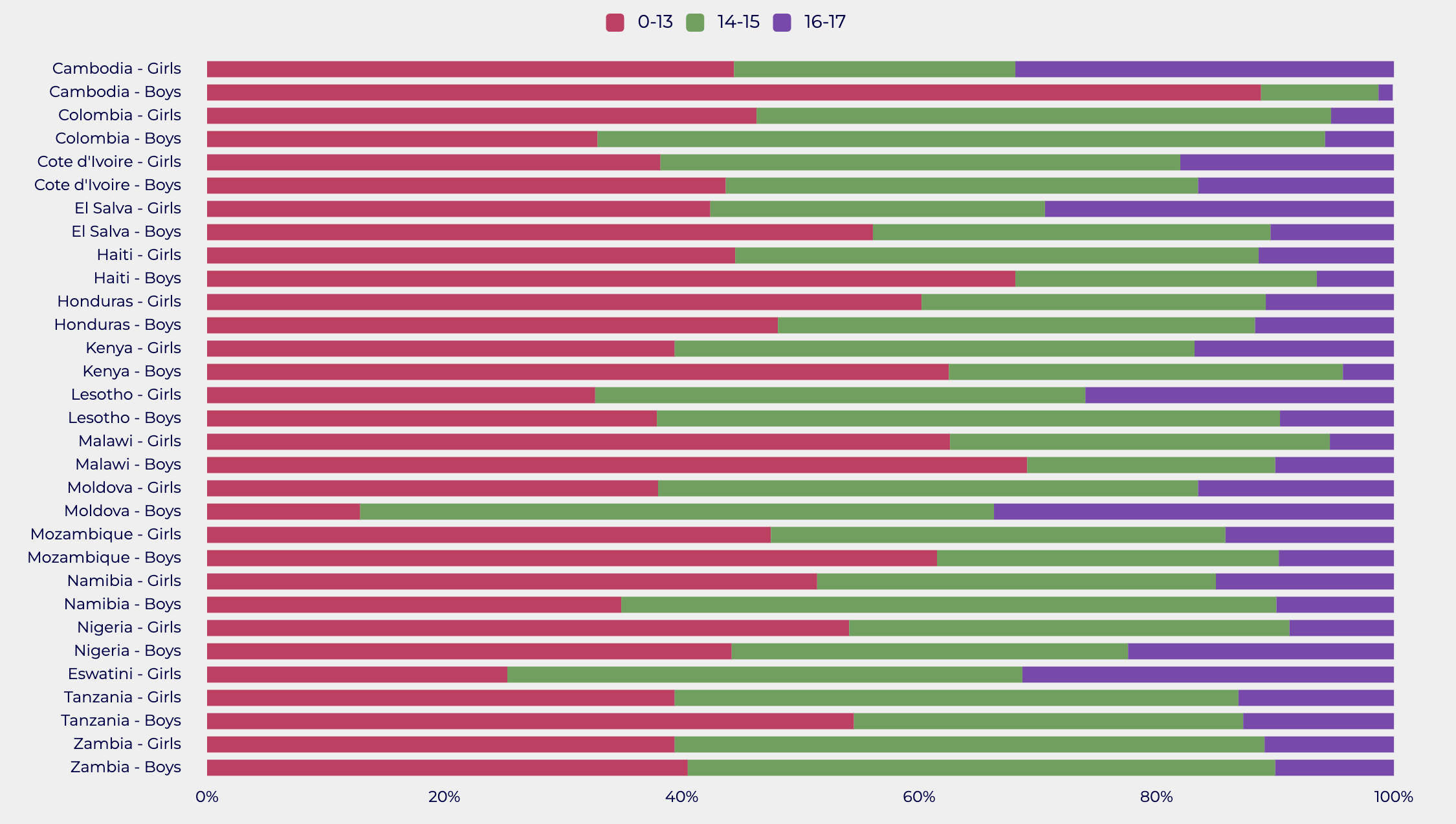 Direct self-reports of adolescents ages 13 to 17 years old across 16 countries in Africa, Latin America and Europe found that 47% of girls and 53% of boys reported that their first experience of sexual abuse happened before age of 13.