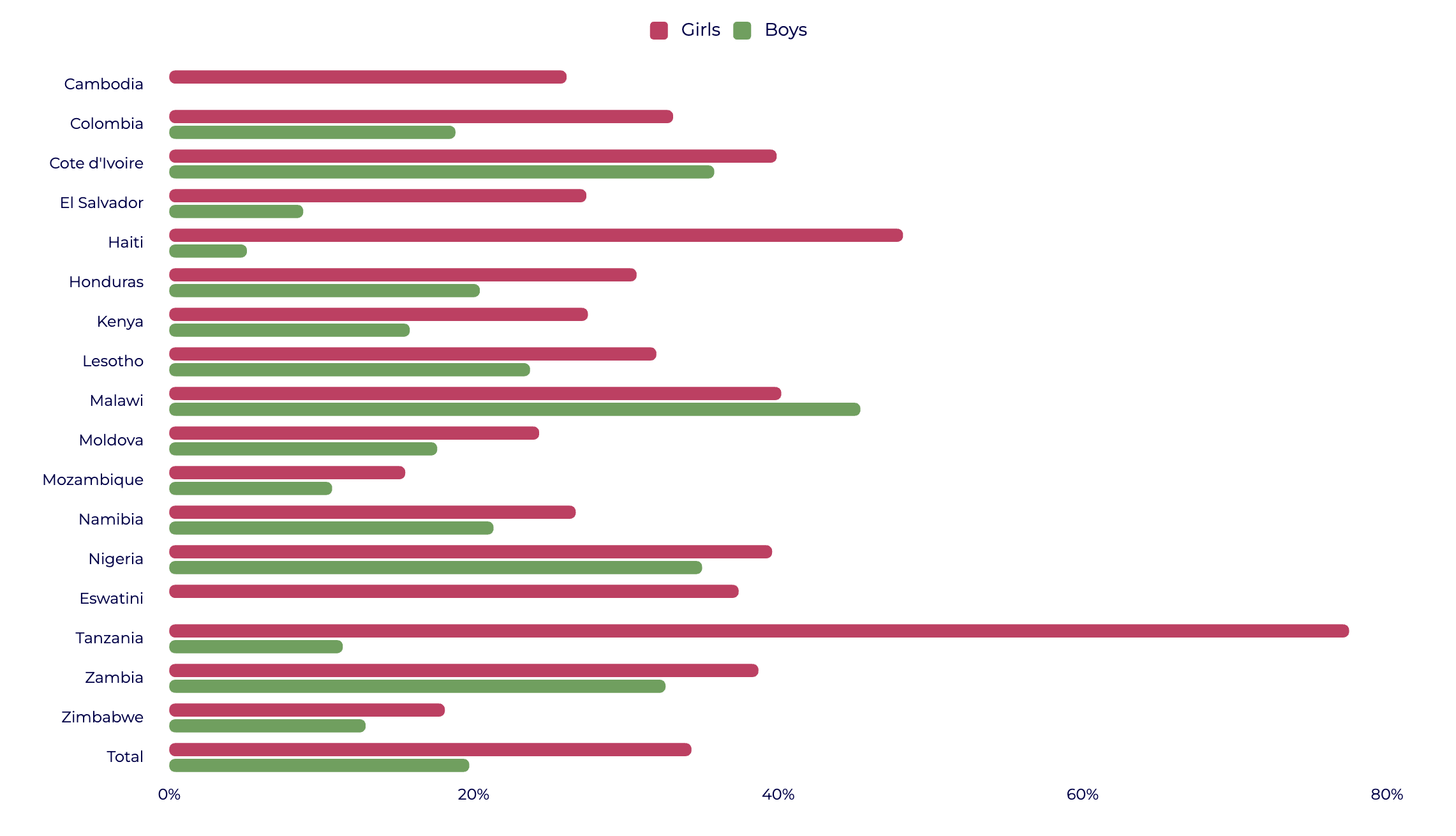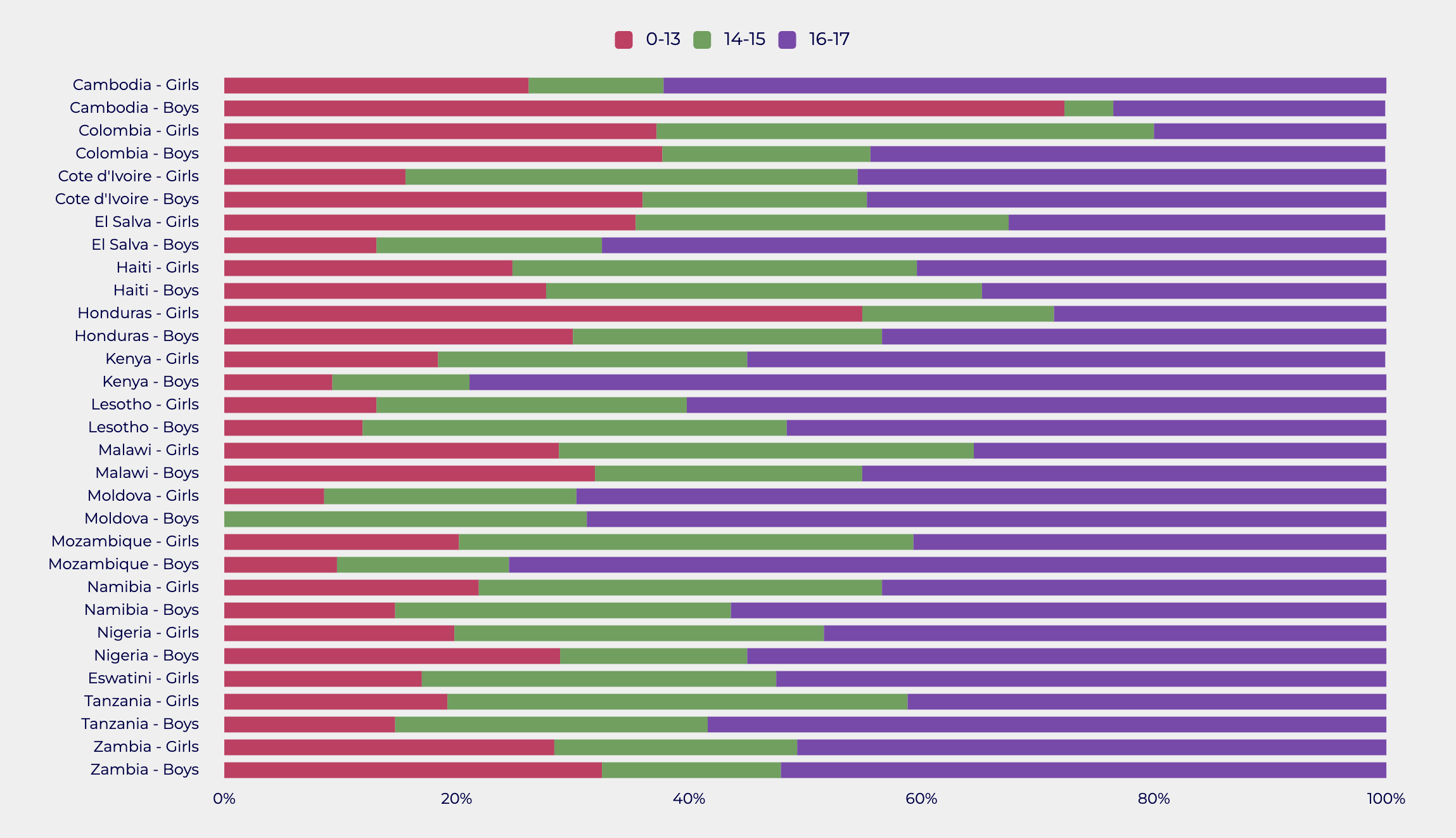 Direct self-reports of adolescents ages 13 to 17 years old across 16 countries in Africa, Latin America and Europe found that 47% of girls and 53% of boys reported that their first experience of sexual abuse happened before age of 13.